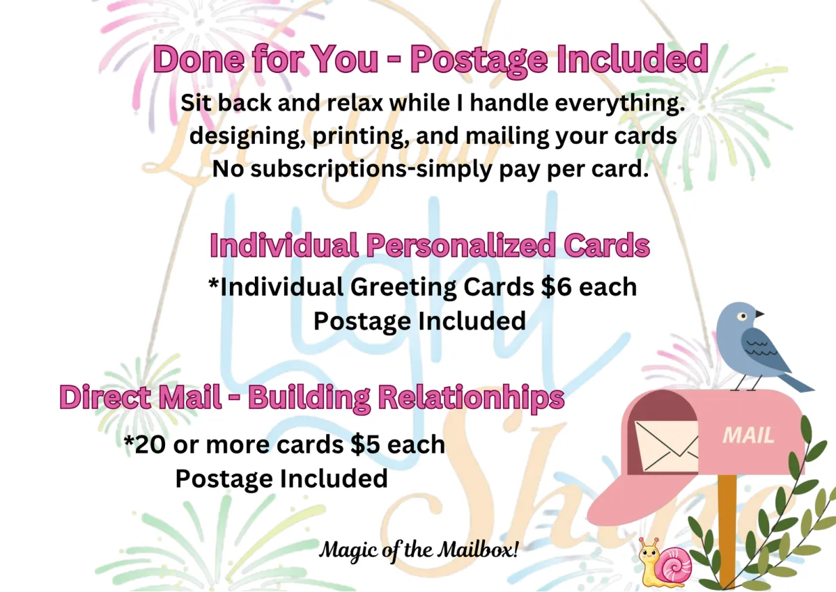 Let me help you grow your business & friendships by sending personalized greeting cards directly to prospects mailbox!